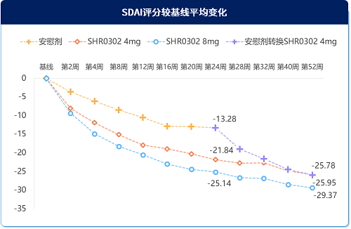艾玛昔替尼治疗2周,可明显改善CDAI和SDAI。与安慰剂相比,SHR0302 4mg和8mg在第2周就显著改善患者CDAI和SDAI,且8mg组改善更好,持续改善至52周(图2)。