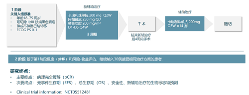 CAP 03-NEO研究(NCT05512481)是一项两阶段、单中心、前瞻性临床试验,计划纳入60例年龄18-75岁的可切除Ⅱ/Ⅲ期肢端黑色素瘤患者。在研究第一阶段,拟纳入30例患者接受两个周期(每周期4周)的三药新辅助治疗,方案包括卡瑞利珠单抗(200 mg IV Q2W)、阿帕替尼(250 mg PO QD)和替莫唑胺(200 mg/m² IV D1-D5 Q4W),随后进行手术,术后进行14个周期的卡瑞利珠单抗辅助治疗(200 mg Q3W)。主要研究终点为病理完全缓解(pCR),次要终点包括无事件生存期(EFS)、总生存期(OS)及安全性等。根据一阶段患者的病理无缓解(pNR)率和风险-获益评估,第二阶段将选择合适的分期患者继续纳入30例接受该围术期方案治疗。